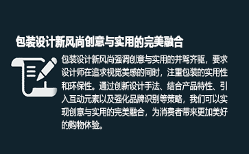 包装设计新风尚强调创意与实用的并重。创意是指设计师在包装设计中运用独特的思维方式和设计手法,创造出新颖、独特、引人注目的视觉效果。实用则是指包装设计在满足产品保护、运输、展示等基本功能的同时,还要关注用户体验和环保需求。这种新风尚要求设计师在追求视觉美感的同时,注重包装的实用性和环保性,实现包装设计与产品本身的和谐统一。