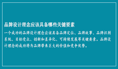 一个成功的品牌设计理念应该具备品牌定位、品牌故事、品牌识别系统、目标受众、创新和差异化、可持续发展等关键要素。品牌设计理念的成功将为品牌带来巨大的价值和竞争优势。
