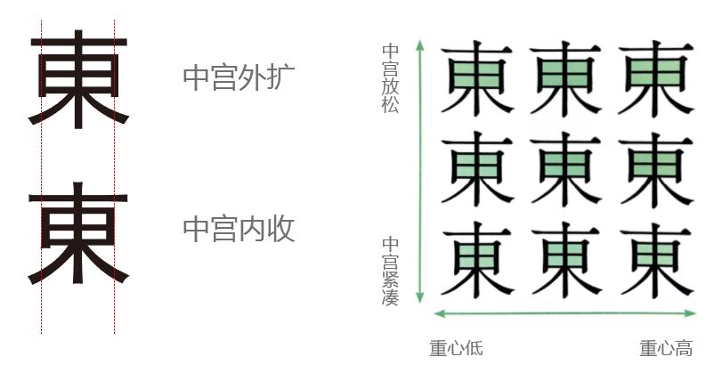 汉字的中宫是形容字体笔画的中心空间。“宫”指字体所处的空间。笔画外扩为“外宫”,向内收为“内宫”。一般认为中宫外扩的字显得比较松,而中宫内收的字比较内敛。